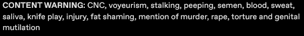 The two worst people you've ever heard of engaging in a frightening night of hardcore sex. Doug is a lonely pervert looking for someone new to stalk. But the woman he finds may be more than he bargained for as she turns out to be a murderer.
